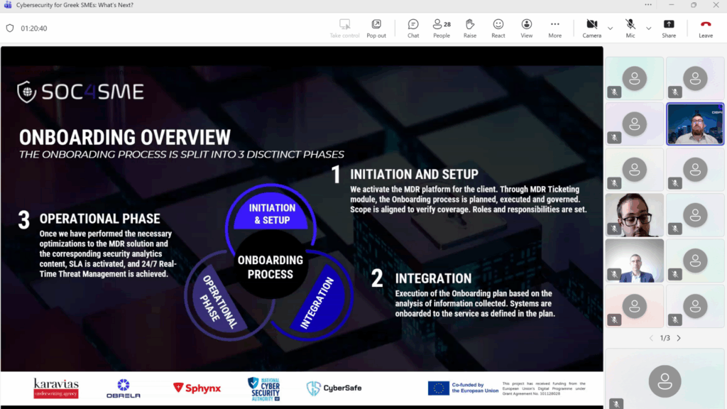 The webinar featured representatives from the project consortium, which brings together public authorities and private organisations with strong expertise in cybersecurity, including the National Cybersecurity Authority of Greece, Sphynx, Obrela, Karavias Underwriting Agency, and CyberSafe. The discussion was moderated by Stergios Asteriou, Special Risks Manager at Karavias Underwriting Agency.