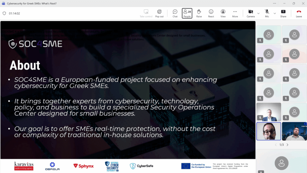 The webinar “Cybersecurity for Greek SMEs: What’s Next?” organised under the SOC4SME project shed light on the knowledge gaps, the growing threats, and the practical solutions offered by this EU-funded initiative, which provides free cybersecurity services to 120 small and medium-sized enterprises across Greece.