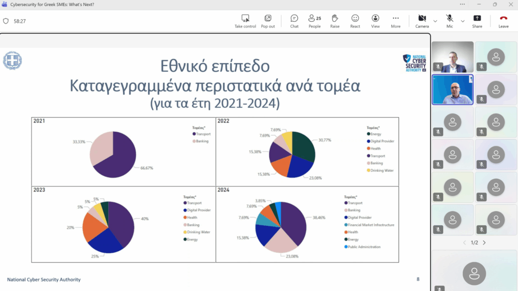 According to data presented by the National Cybersecurity Authority, cyber incidents in Greece have increased and diversified between 2021 and 2024, targeting primarily the transport, banking, energy, health, and public administration sectors. The transport sector remained the most affected (40% of incidents in 2023 and 38.46% in 2024), followed by digital service providers and banks. For the first half of 2025, the public administration (27.14%), digital providers (12.86%), and health sector (11.43%) were the main targets, with DDoS and ransomware attacks causing the most significant damage.