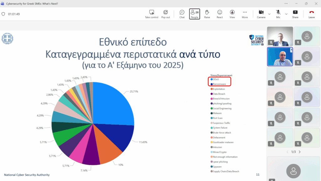 Opening the session, Mr. Thomas Dompridis, General Director of Operational Planning at the National Cybersecurity Authority of Greece, noted that “cyberattacks in Greece are rarely targeted against specific organisations; rather, they occur when vulnerabilities are detected within information systems.” He emphasised that “attackers do not discriminate – they exploit weaknesses regardless of a company’s size or financial capacity,” urging SMEs to adopt simple, cost-effective security measures.