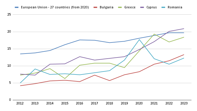 To validate the trend toward e-business, a chart is provided below, illustrating the percentage of EU enterprises (the SMEs dominate the due to sheer numbers) having received orders online (at least 1% of sales), over the last decade. The sample of EU members is focused on the southeastern part of the Union for a good reason: it displays the EU members that did not adopt digital technologies a decade ago. The chart displays that the selected EU members are fast converging to the EU average, even though the EU average is stepping up; therefore the necessity to further secure their business from cyber threats is also increased.